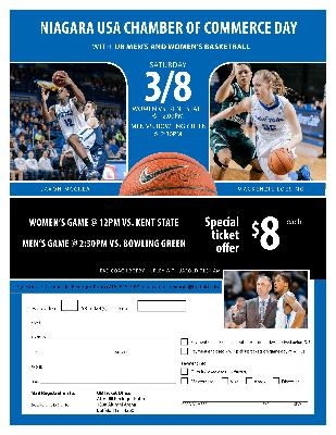 Events Niagara USA Chamber of Commerce Day with UB Men's and Women's Basketball Share: Name: Niagara USA Chamber of Commerce Day with UB Men's and Women's Basketball Date: March 8, 2014 Event Description: Join us for Niagara USA Chamber of Commerce Day with UB Men and Women's Basketball! Watch Javon McCrea and Mackenzie Loesing lead to Bulls to victory! Event Media: To Current Calendar Location: University at Buffalo Alumni Arena Visit UBBulls.com for more information Date/Time Information: Saturday, March 8th UB Women vs. Kent State @ 12PM UB Men vs. Bowling Green @ 2:30PM Contact Information: (716) 645-3991 Send an Email Fees/Admission: SPECIAL TICKET PRICE: $8 Questions? Contact Jill Rexinger-Kuhn at (716) 645-3991 or via email: rexinger@buffalo.edu Set a Reminder: Enter your email address below to receive a reminder message. -- Select Days Before Event -- 1 Day 2 Days 3 Days 1 Week Captcha Validation Please complete the Captcha To Current Calendar