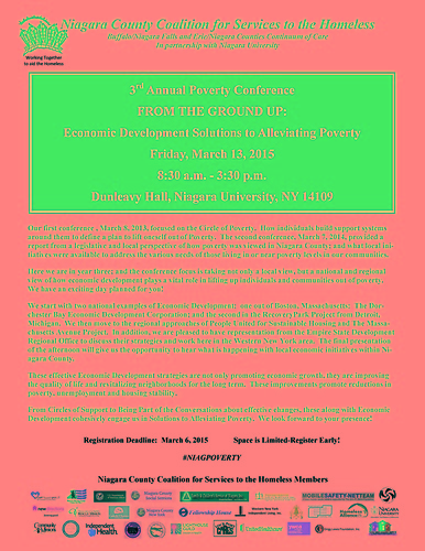 The Niagara County Coalition of Services to the Homeless, Niagara University and the Homeless Alliance of Western New York (Buffalo/Niagara Falls and Erie/Niagara Counties Continuum of Care) are hosting their 3rd Annual Poverty Conference. This years conference is entitled From the Ground Up: Economic Development Solutions to Alleviating Poverty.